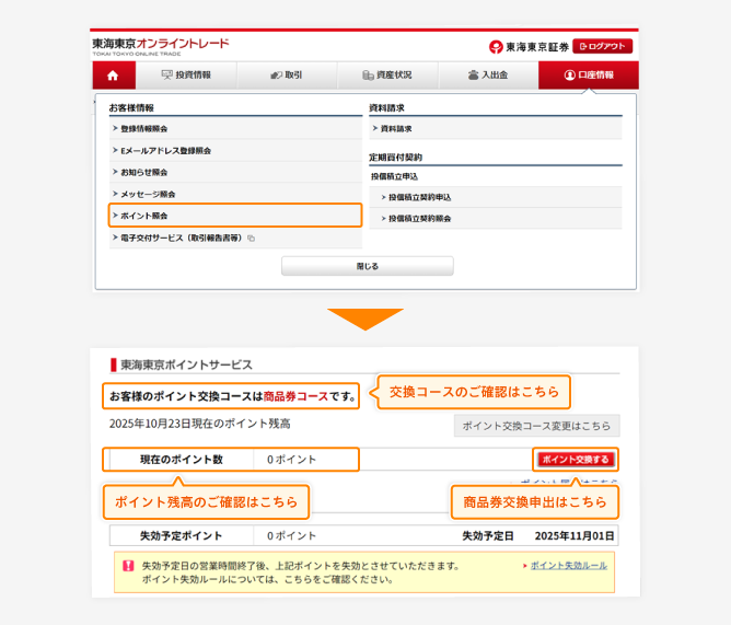 ポイント交換コース、ポイント残高のご照会および商品券交換申出は、オンライントレードにてご確認、お手続きいただけます。