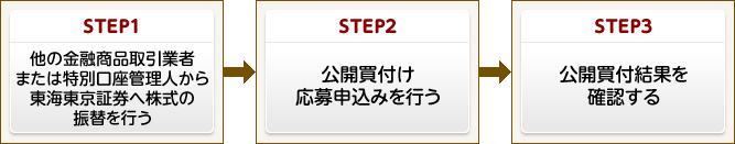 ご応募される株式等が記録・管理されている金融商品取引業者または特別口座管理人に東海東京証券への振替をご依頼いただき、「口座振替申請書」または「特定口座内保管上場株式等移管依頼書」をご提出ください。