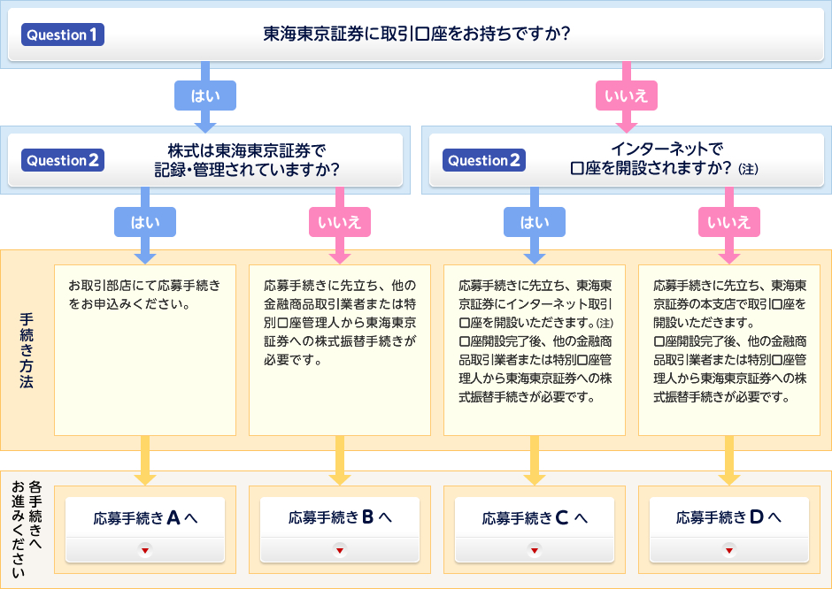 (注)「インターネットでの口座開設」は個人の方のご応募のみを対象としております。東海東京証券に取引口座をお持ちでない法人様につきましては、応募手続きD(東海東京証券の本支店での手続き)をご選択くださいますようお願いいたします。